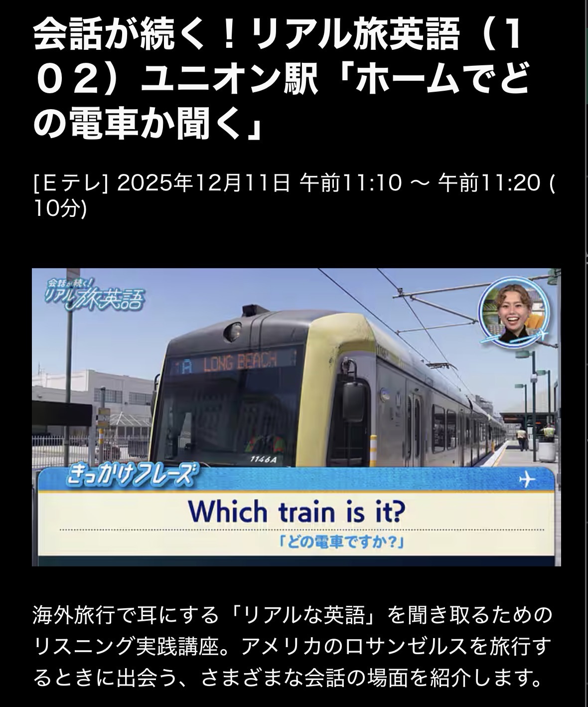 会話が続く! リアル旅英語 25/12/11(木)L102 ホームでどの電車か聞く