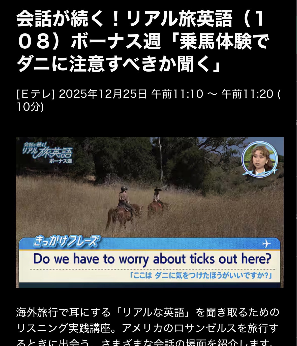 会話が続く! リアル旅英語 25/12/25(木)L108 乗馬体験でダニに注意すべきか聞く