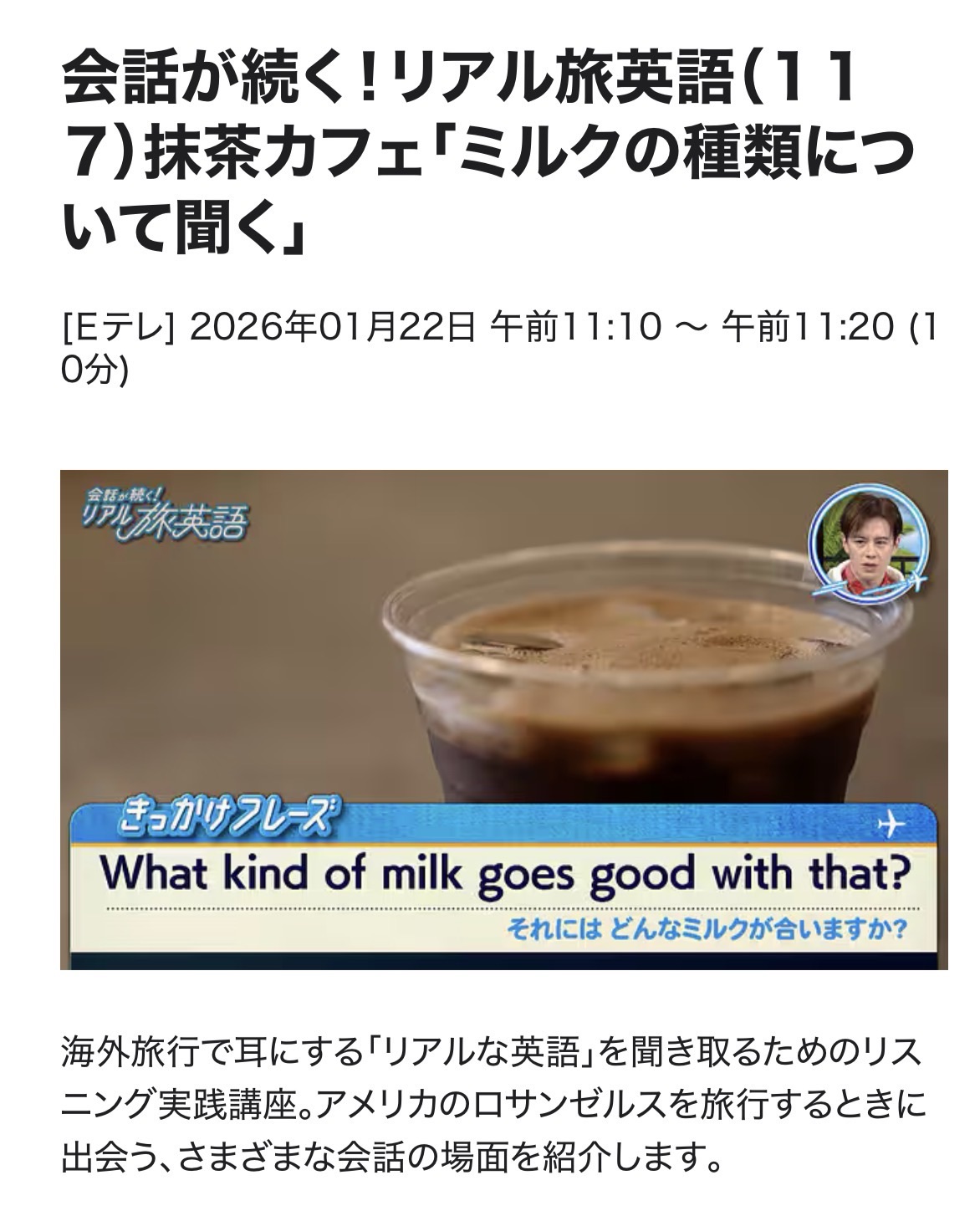 会話が続く! リアル旅英語 26/1/22(木)L117抹茶カフェ「ミルクの種類について聞く」