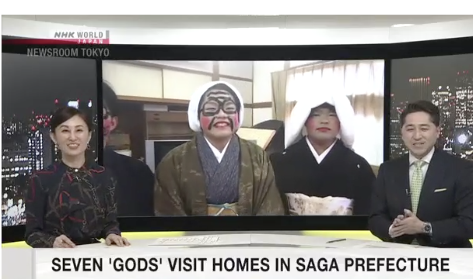 日曜日、西日本の佐賀県で、七福神に扮した地元の人々が各家庭を訪れ、豊作と健康を祈りました。