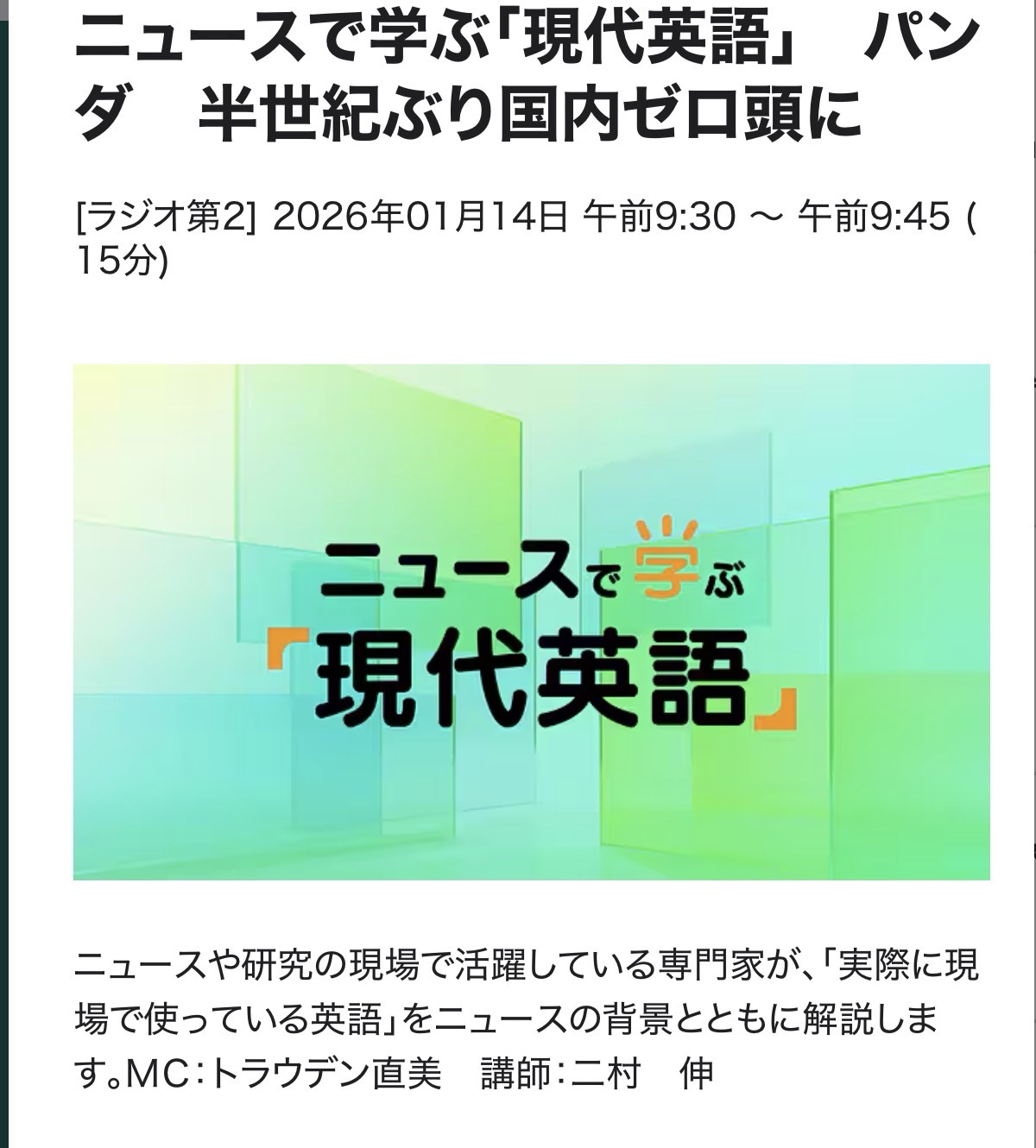 ニュースで学ぶ現代英語 26/1/14(水)パンダ 半世紀ぶり国内ゼロ頭に